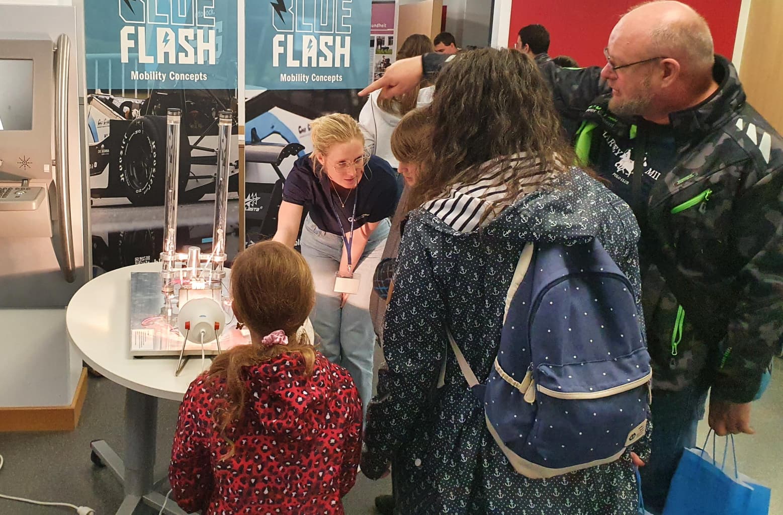 Die Messe bot ein vielfältiges Programm mit spannenden Technikvorführungen und interaktiven Ausstellungen, bei denen Kinder und Jugendliche Naturwissenschaften hautnah erleben konnten. Auch der Sonderforschungsbereich 1633 war mit einem eigenen Stand vertreten und zeigte faszinierende Mitmachexperimente zur Ladungstrennung mithilfe eines Bandgenerators sowie einer schiefen Ebene, auf der sich zwei gleich geladene Kunststoffstäbe abstießen und dadurch erstaunlicherweise die Ebene wieder herauf rollten. Auch luden Experimente zur Photosynthese und zur Energiespeicherung zu Diskussionen über nachhaltige Chemie und Forschungsfelder in der Universität ein.